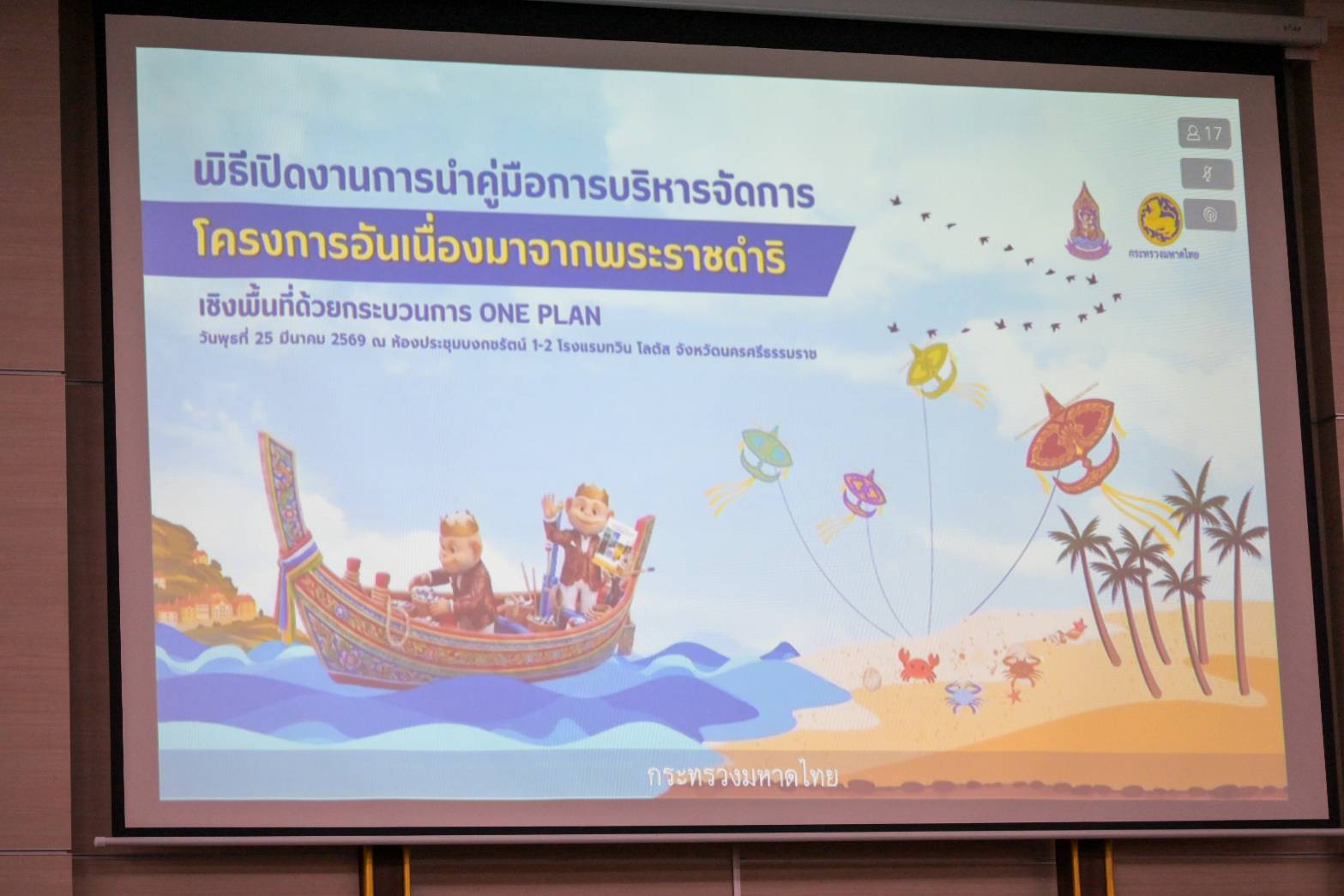 วันที่ 25 มีนาคม 2569 เวลา 10.00 น. ผู้อำนวยการสำนักงานชลประทานที่ 17 มอบหมายให้ นางสาวขนิษฐา ซุ้นห้อง หัวหน้าฝ่าpโครงการพิเศษ พร้อมด้วย ผู้อำนวยการโครงการส่งน้ำและบำรุงรักษาโก-ลก และหัวหน้าฝ่ายในสังกัดสำนักงานชลประทานที่ 17 ร่วมพิธีเปิดงานการนำคู่มือการบริหารจัดการโครงการอันเนื่องมาจากพระราชดำริเชิงพื้นที่ด้วยกระบวนการ One Plan มาสนับสนุนการดำเนินงานโครงการอันเนื่องมาจากพระราชดำริ เขตพื้นที่ภาคใต้ เพื่อส่งเสริมและเผยแพร่การนำคู่มือการบริหารจัดการโครงการอันเนื่องมาจากพระราชดำริเชิงพื้นที่ด้วยกระบวนการ One Plan ไปใช้ในการปฏิบัติงานอย่างเป็นรูปธรรม และบูรณาการแผนงาน/โครงการของหน่วยงานต่าง ๆ ให้สอดคล้องและเชื่อมโยงกันในระดับพื้นที่ภาคใต้ โดยมี นายชาคริต สุรณัฐกุล รองผู้ว่าราชการจังหวัด เป็นประธานการประชุม ณ ห้องประชุมพระภิสัยสุนทรการ ชั้น 4 ศาลากลางจังหวัดนราธิวาส แห่งที่ 2 อำเภอเมือง จังหวัดนราธิวาส